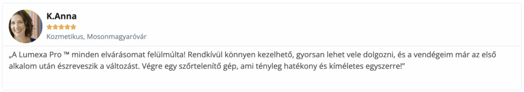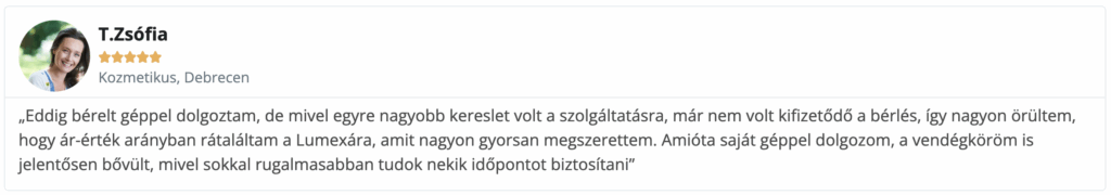 A Lumexa fejlesztésébe az eladó több mint 15 év kozmetikai tapasztalata épült be, így az eszköz minden paramétere a valós igényekre szabott.
